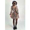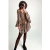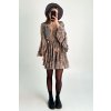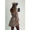 Šaty v A-strihu v etno štýle z príjemného ľahkého materiálu s prímesou hodvábu. Šaty sú prestrihované pod prsiami, dekolt v tvare V je zdobený bombíkmi a rukávy su ukončené masívnym volánom