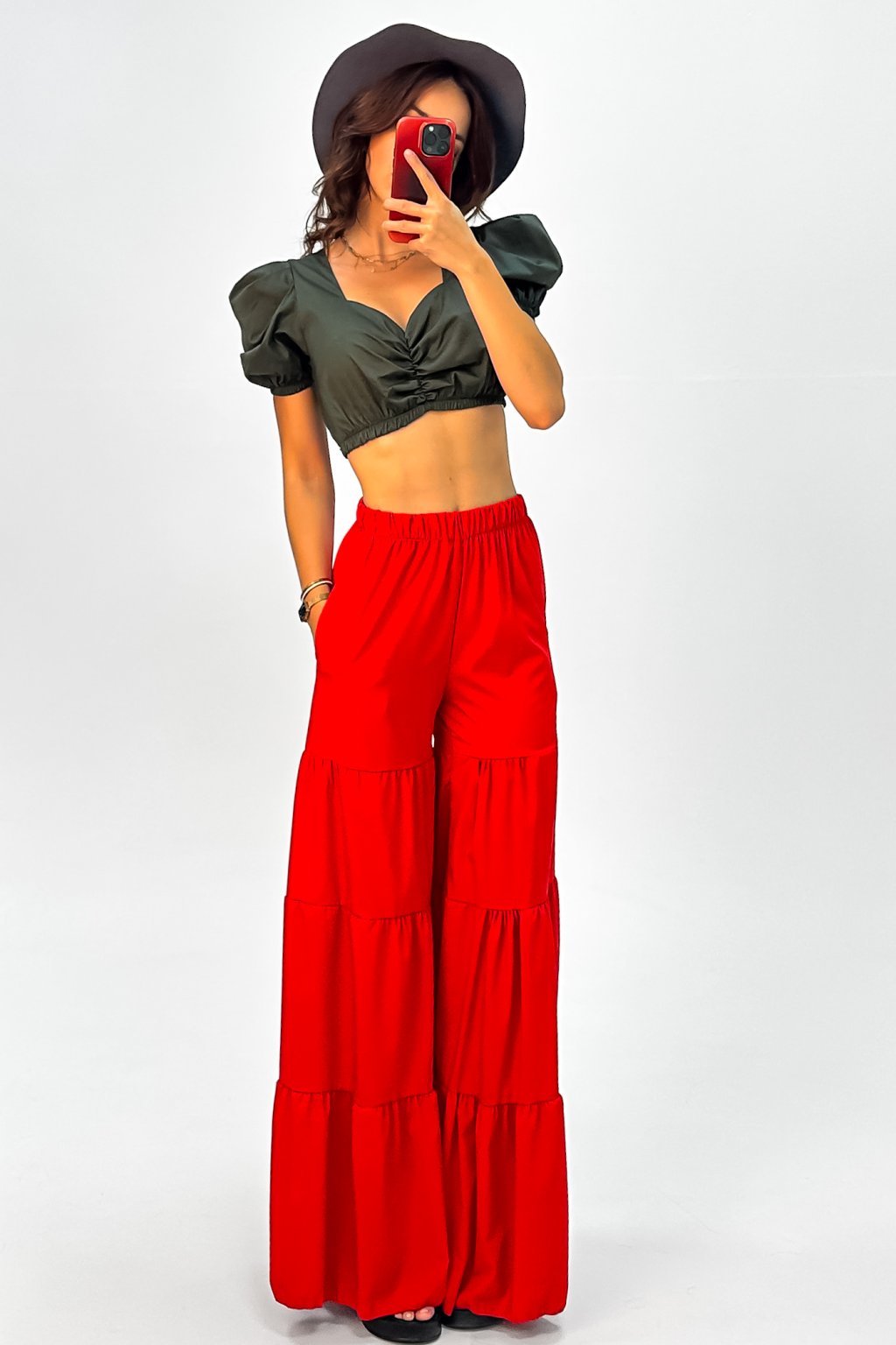 Pohodlné a štýlové dámske nohavice s vreckami. Vysoký elastický pás krásne sadne na postavu a zabezpečí komfort počas celého dňa. Voľný strih s padavými volánovými vrstvami pôsobí ležérne, no zároveň elegantne – ideálne na festivaly, dovolenku, letné prechádzky či neformálne oslavy.