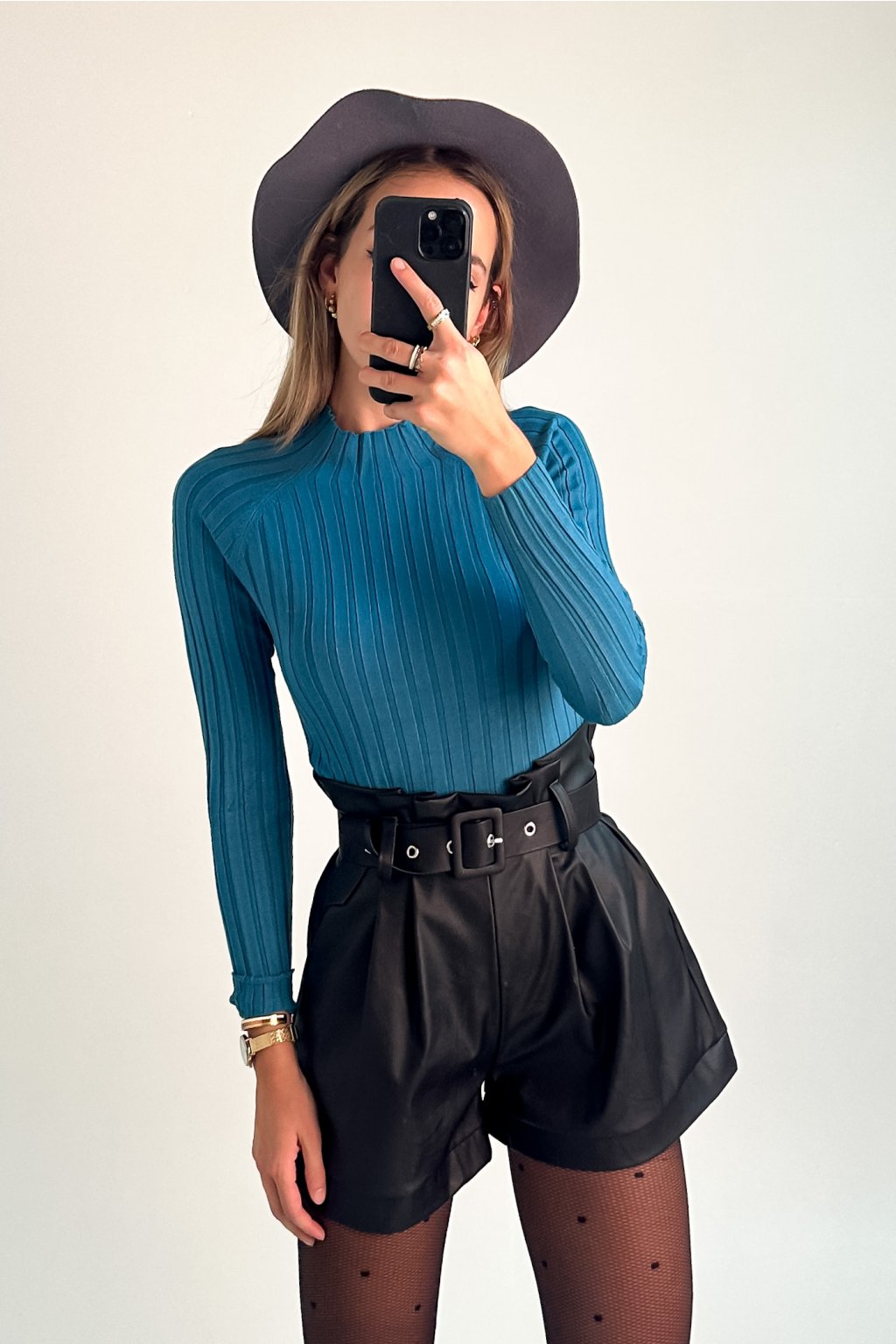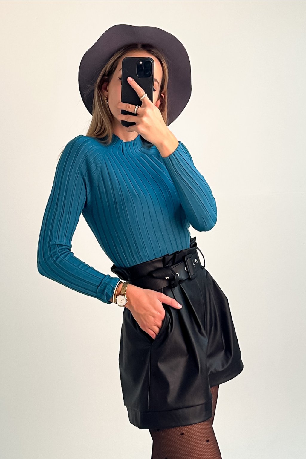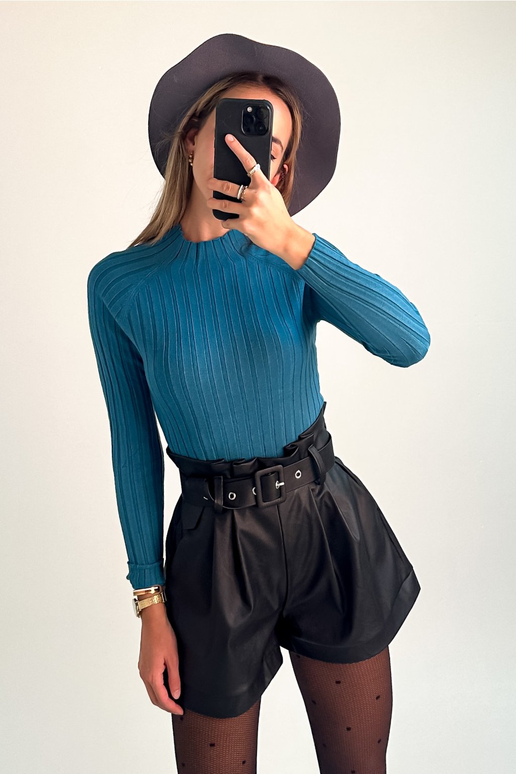 Vrúbkovaný polorolák ku krku s priliehavým golierom z príjemného materiálu.