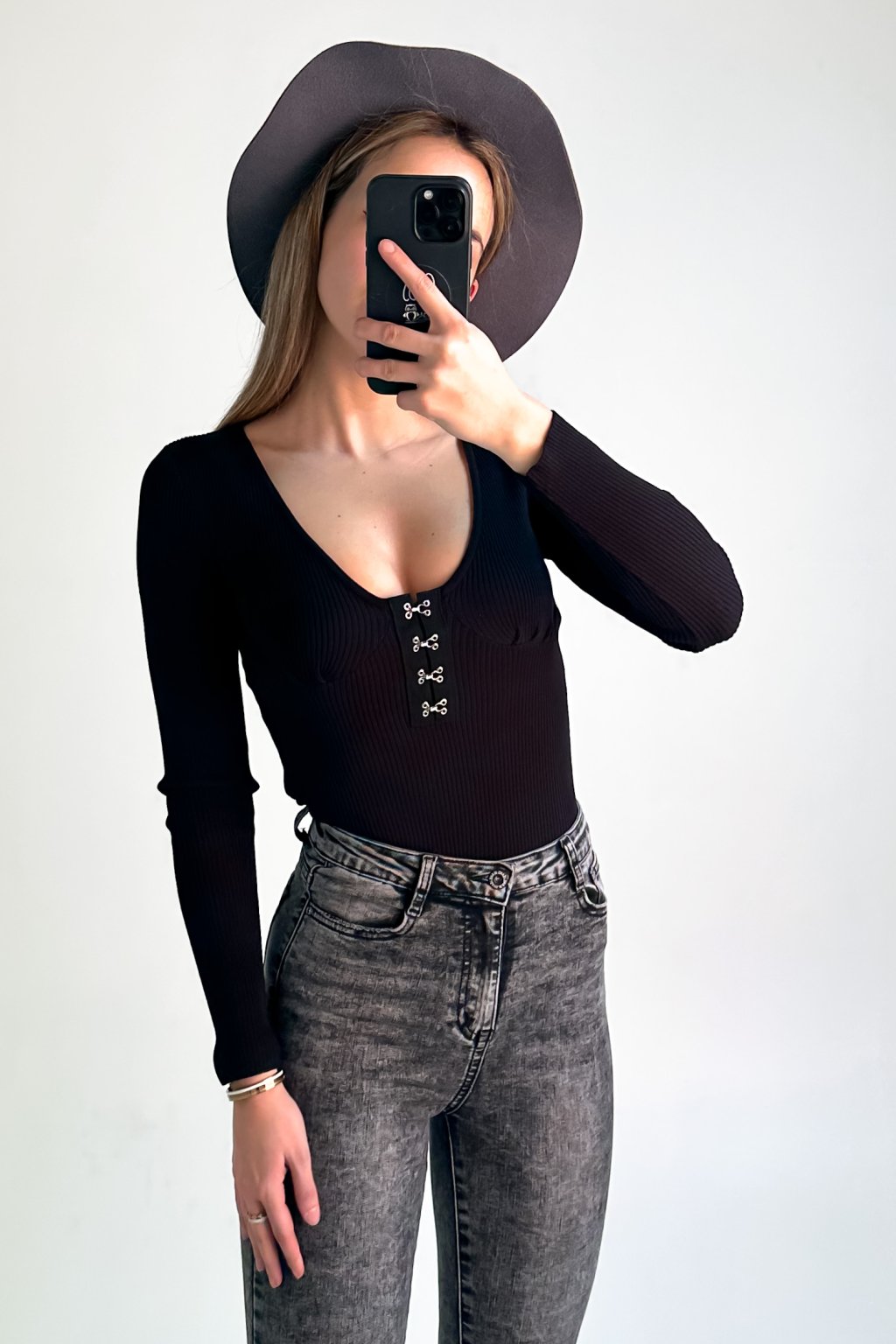 Vrúbkovaný top s V-výstrihom čierny