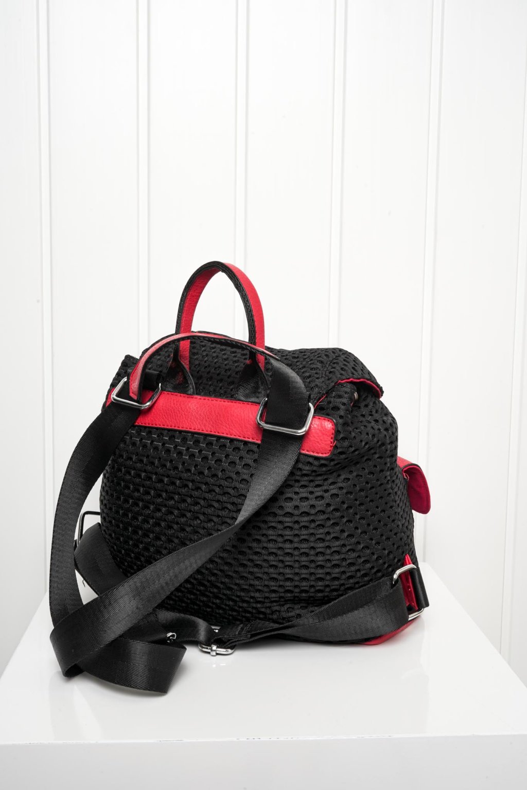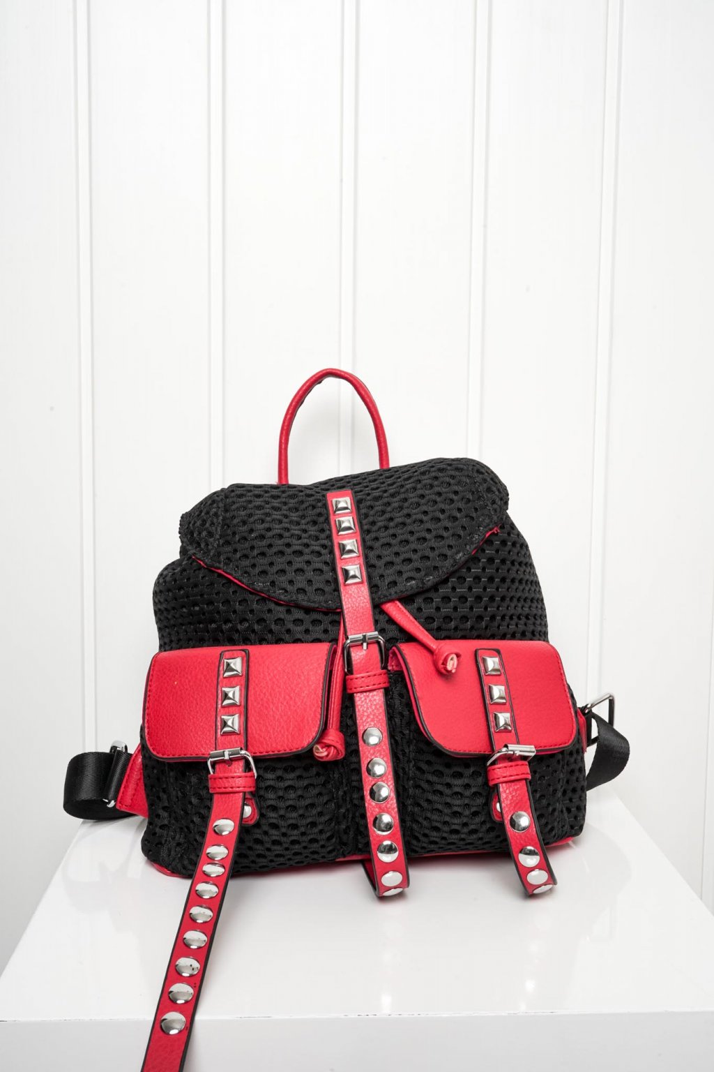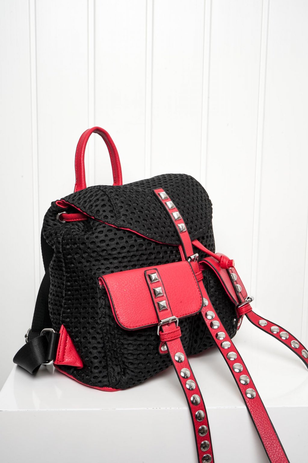 Čiernočervený ruksak z imitácie kože v kombinácii s limitovaným textílnym materiálom a vybíjaním striebornými pyramídkami.