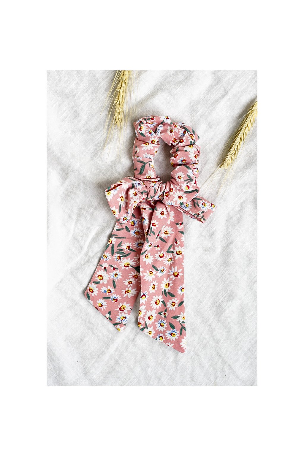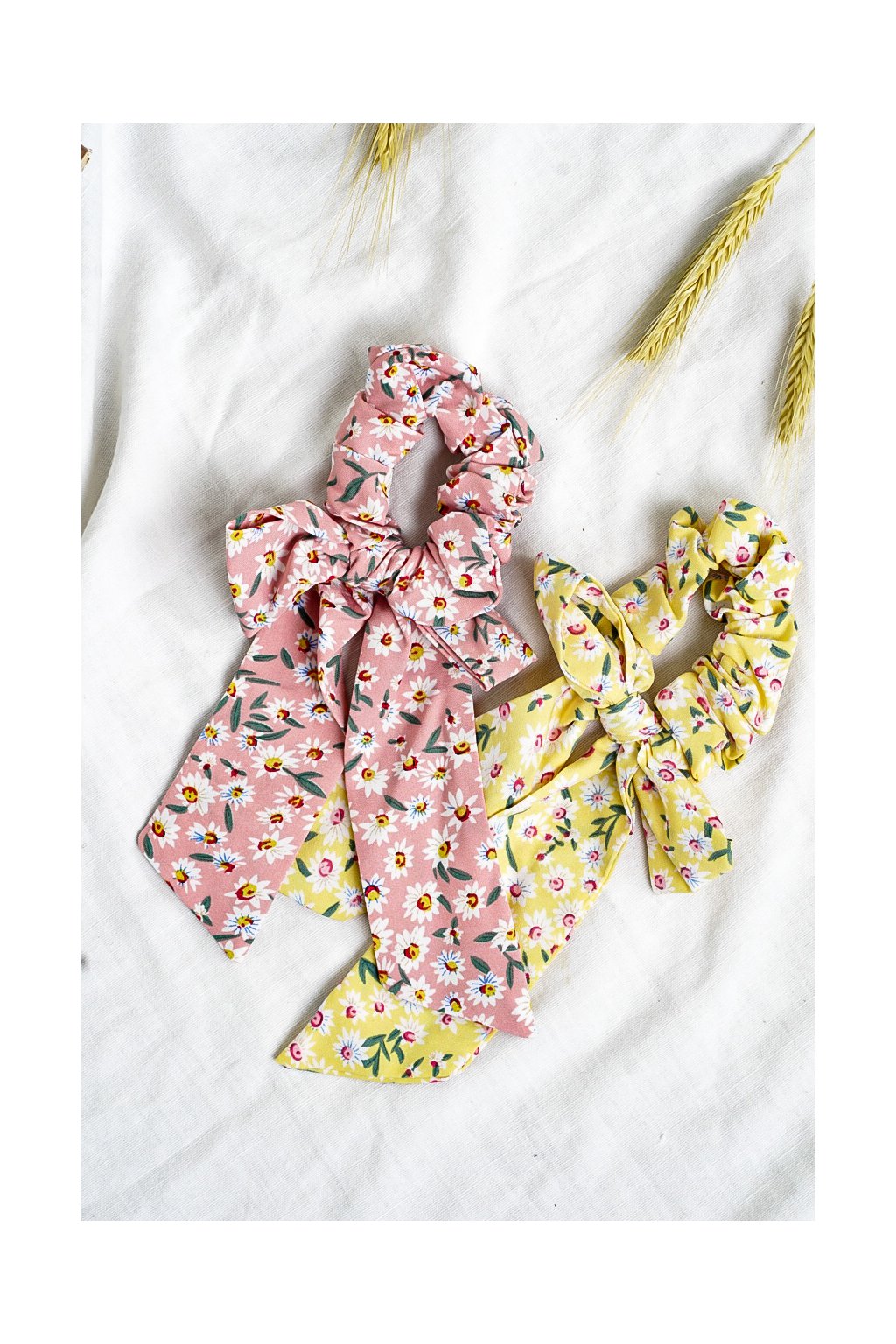 Komplet dvoch gumičiek do vlasov v ružovej a žltej farbe s kvietkovanou potlačou a odoberateľnou ozdobnou mašličkou.