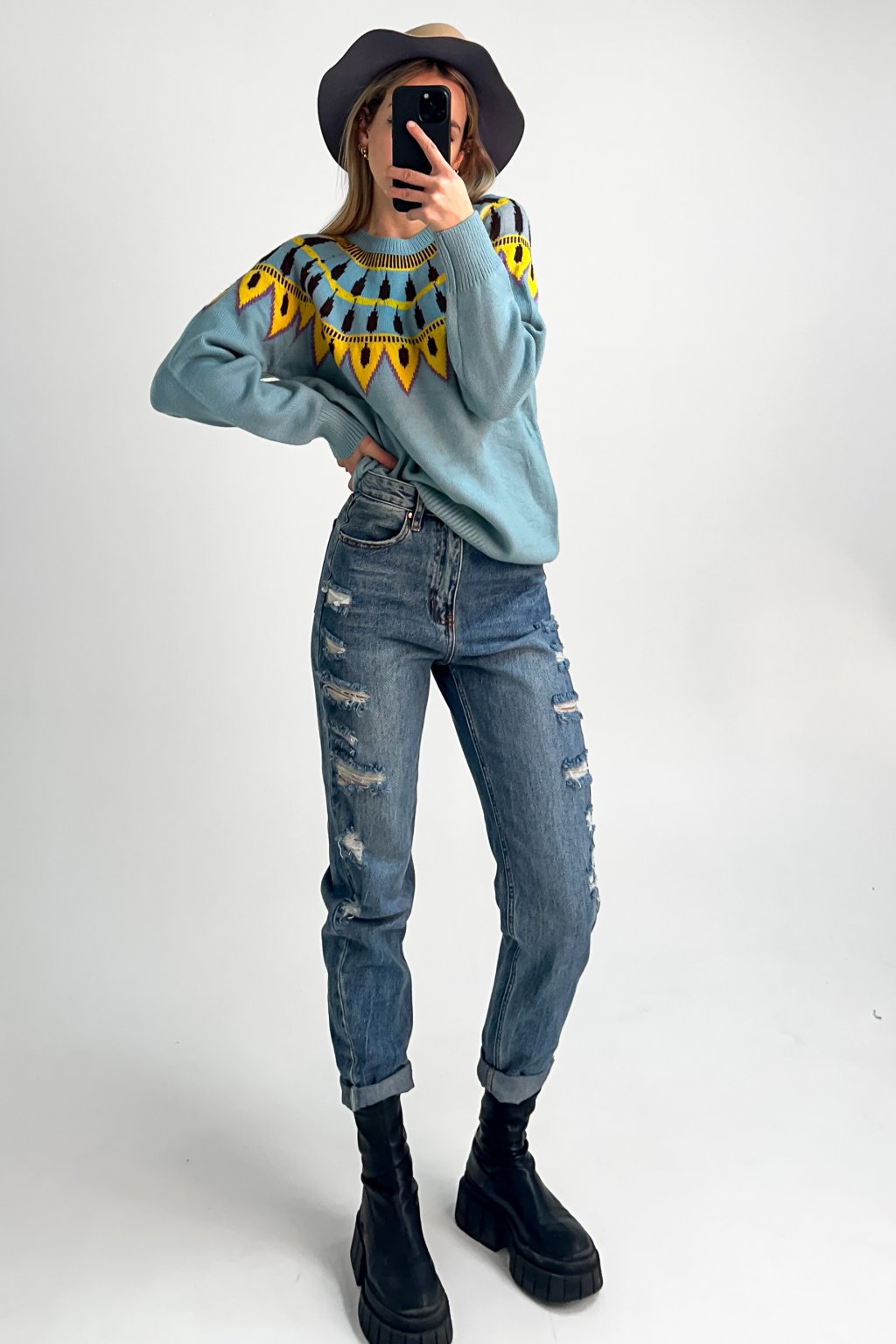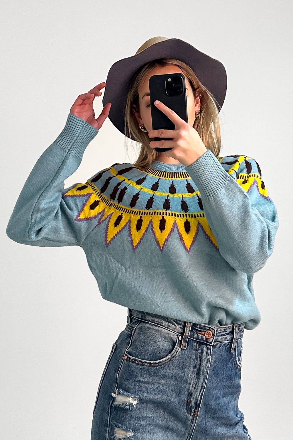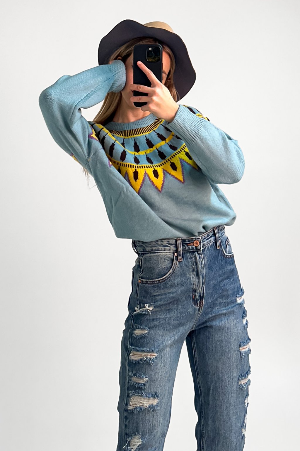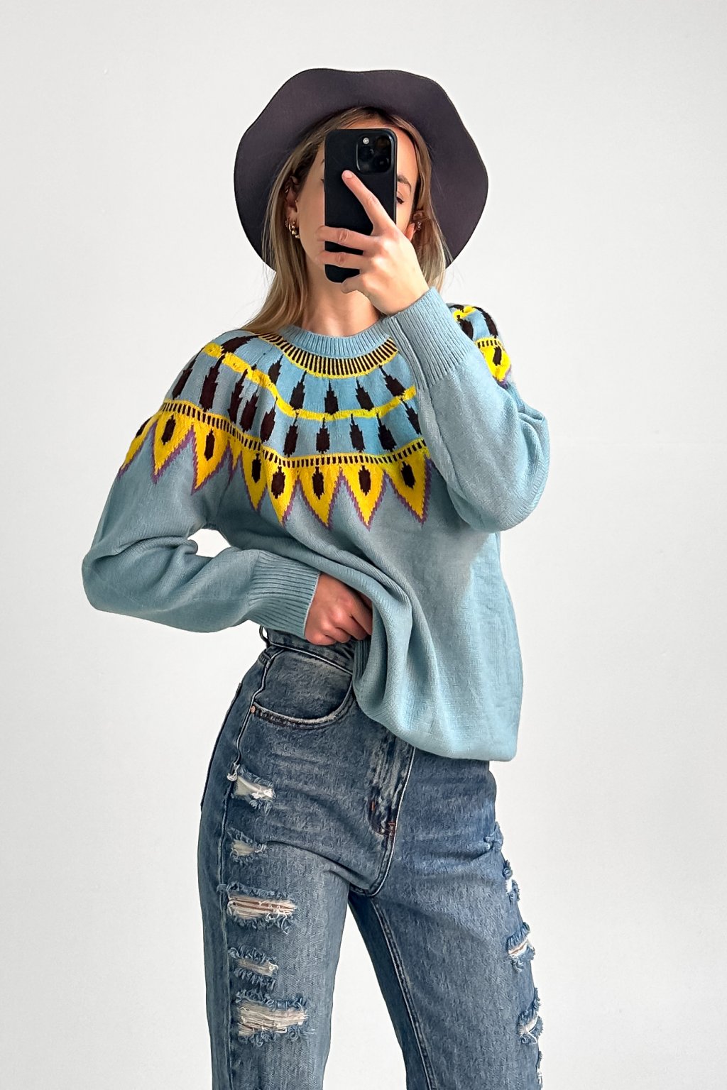 Vzorovaný sveter vo voľnom strihu z príjemného materiálu.