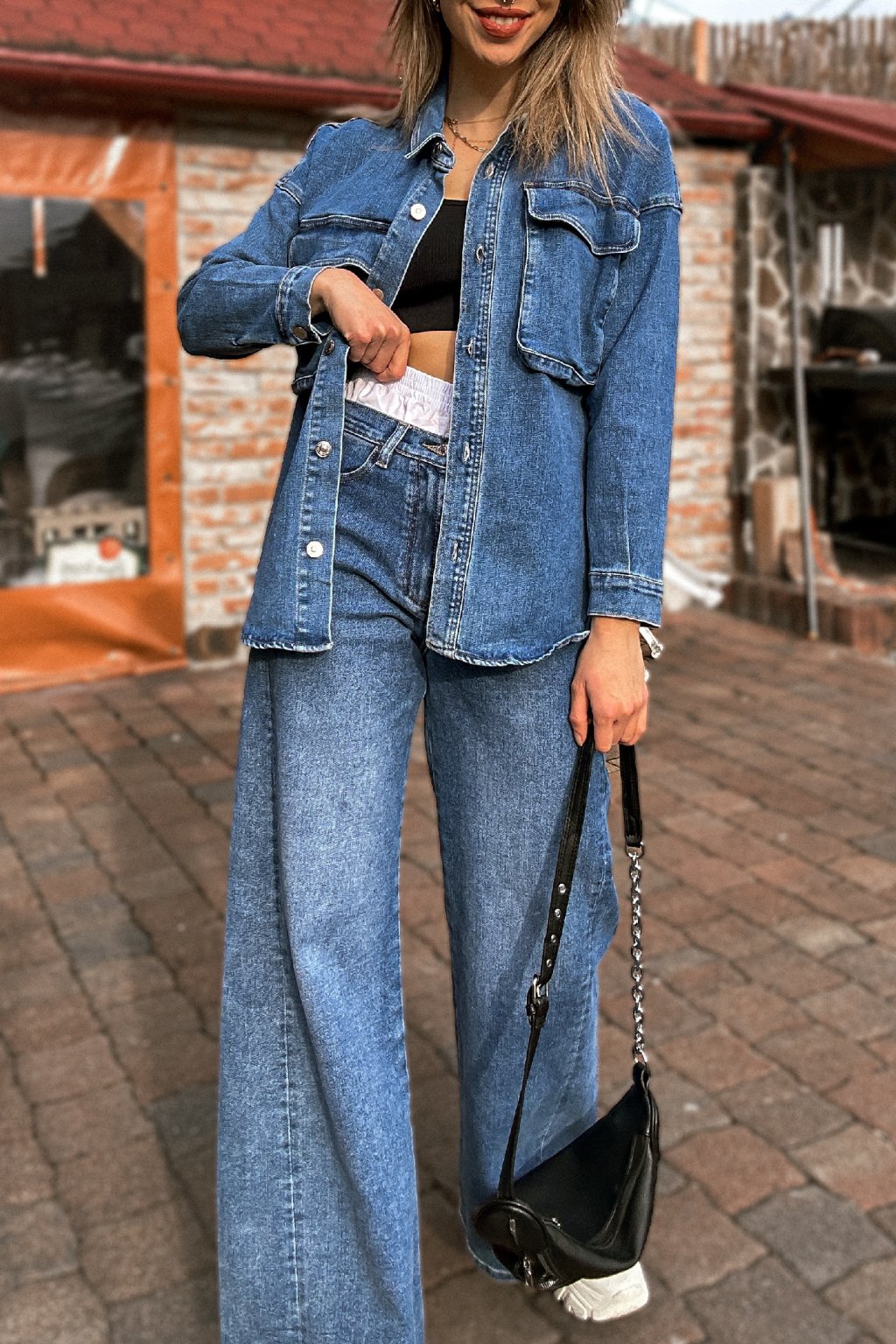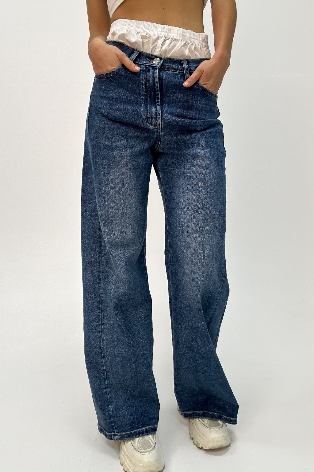 Wide leg modré džínsy s efektom vyčnievajúcej spodnej bielizne