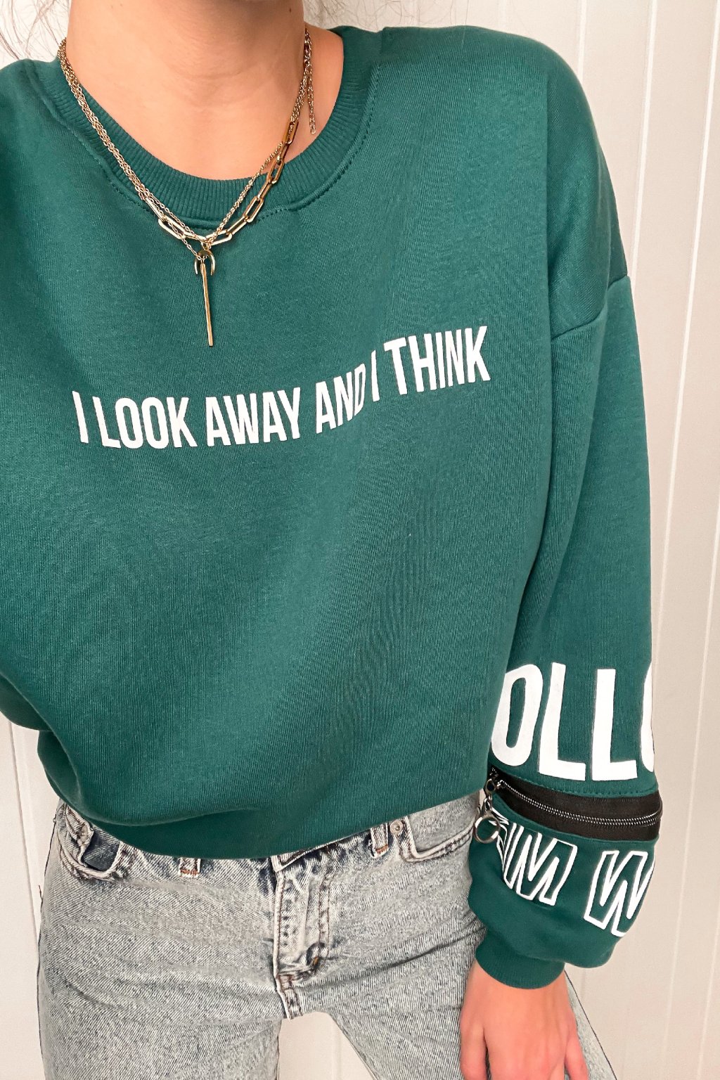 Zelená mikina s nápisom "I look away and I think". S funkčným zipsom na rukávoch a nápisom "follow me".